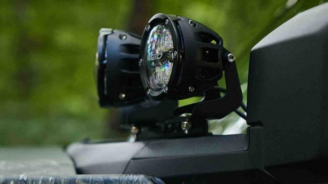烈马为适应雨林阴暗潮湿的环境, Sasquatch Searcher 大功率探照灯是专门安装在挡风玻璃下面的。一侧两个,两侧四个,可以为车辆提供 180 宽度直射范围。