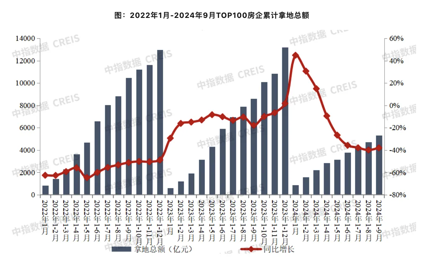 据中指研究院统计,2024年1-9月,TOP100公司征地总额为5324亿元,同比下降38.1%,受去年低基数影响,比1-8月下降1.9。%。2024年前三季度,全国300个城市的住宅用地供需规模同比下降30%以上,土地出让金下降40%以上,第三季度同比下降略有收窄。在土地拍卖方面,在房地产企业征地前线收缩的情况下,只有一些热点城市的优质地块房地产企业积极参与拍卖,但底价转让仍然是大多数城市的正常土地拍卖。前三季度,300个城市的平均交易价格同比下降13.3%,溢价率较去年同期下降0.7%%,征地公司仍然集中在中央国有企业和地方国有资产。
