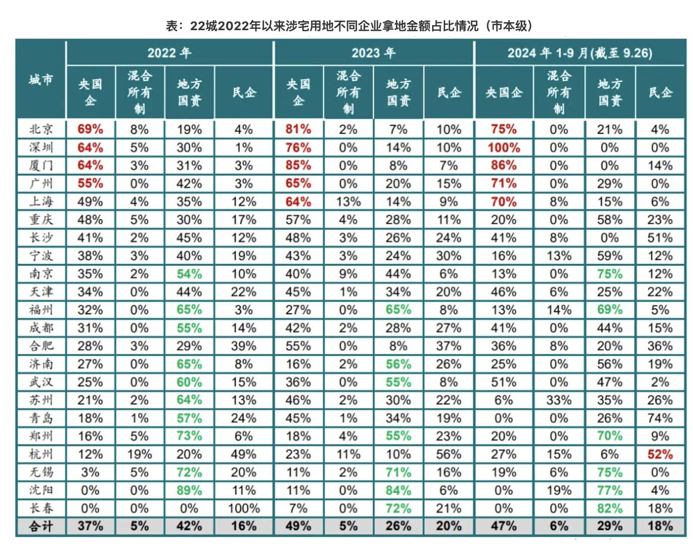 在征地公司方面,央国企和地方国有资产仍然是主力,民营企业征地信心仍然较弱,房企投资信心的提升依赖于销售企稳。据中指数据显示,2024年1-9月(截至9月26日),中央国有企业占22个城市累计征地金额的47%,地方国有企业占29%,两者总数达到76%,是征地的绝对主力军。具体来说,北京、广州、上海、深圳等地的中央国有企业占比较高,而福州、郑州、无锡、沈阳等地的地方国有资产是征地的主力军。只有少数城市的民营企业获得了相对较高的土地。比如近两年杭州民营企业获得土地的比例都很高,滨江、建杭、兴耀等当地民营企业继续获得土地。2024年1-9月,杭州民营企业获得土地的比例为52%。