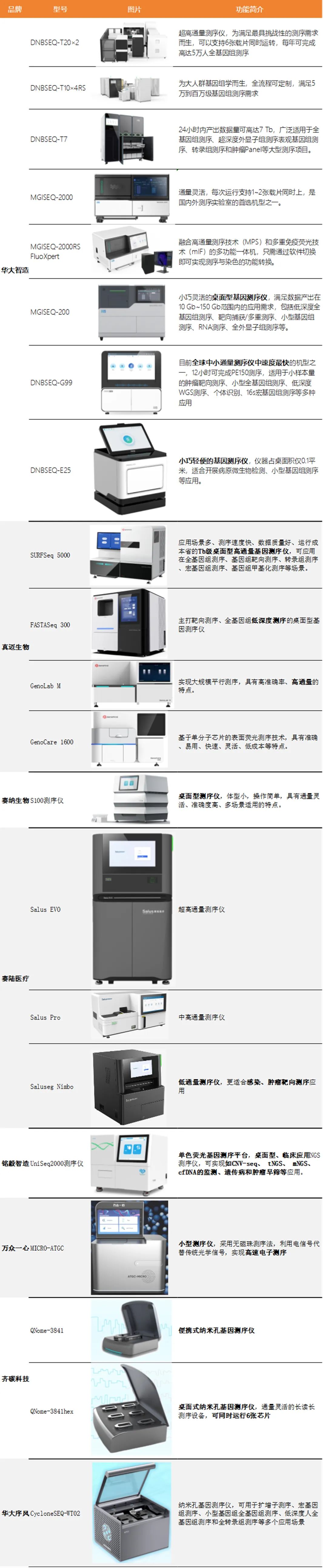 让我们看看功能。基因测序仪制造商主要通过引入不同的通量模型来覆盖广泛的使用场景。。高通量型号主要用于服务大型、大型人群的基因测序需求,如大型人群的全基因组测序、超深层外显子组测序、肿瘤Panel测序等,通常需要使用高通量测序仪。常规科研实验室主要采用中通量基因测序仪,临床上主要采用低通量基因测序仪,如肿瘤和传染病的靶向测序、肿瘤早期筛查、遗传病筛查等。在中国,华大智能制造、真迈生物、赛陆医疗已经完成了覆盖高、中、低通量基因测序仪的产品建设,从而满足各种场景下的基因测序需求。