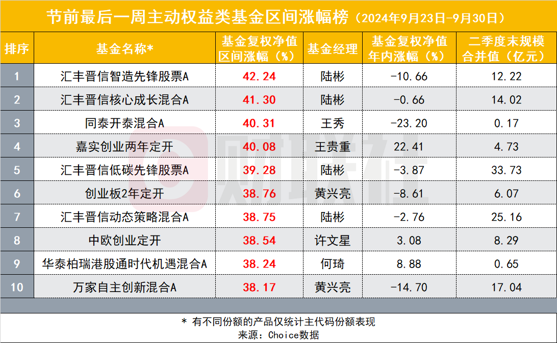 以该区间单位净值涨幅在全市场排名第一、陆彬汇丰晋信智造先锋为例,该基金A类股份涨幅高达42.24%。节前最后一个交易日,截至第二季度末,该基金前十大尴尬股中,除明阳智能因上市公司“只”上涨9.98%外,其余9只股票最低涨幅为17.22%,其中1亿纬锂能、东方财富等4只股票被封20CM涨停。