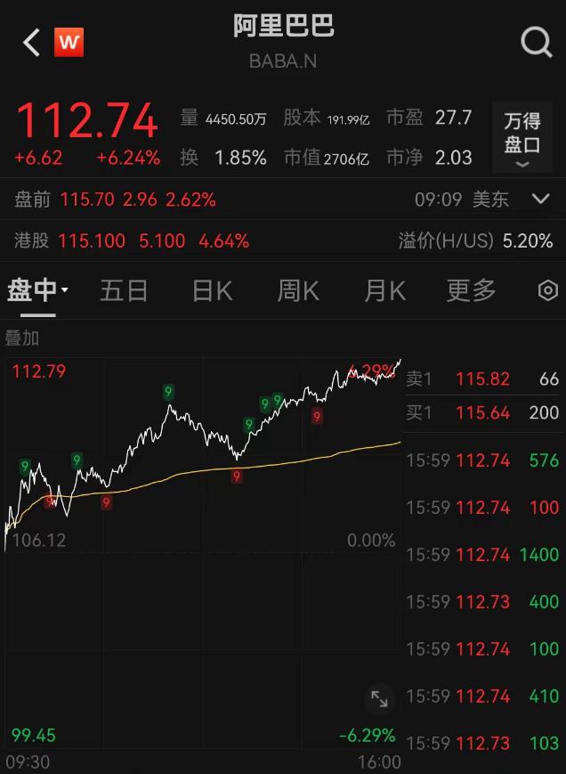 美东时间 2024 年 10 月 1 日前,阿里巴巴美股股价一度迅速上涨,截至收盘,上涨, 6.24%,报收 112.74 美金。10 月 2 日晚,阿里盘前继续上涨,涨幅约为。 2.6%。