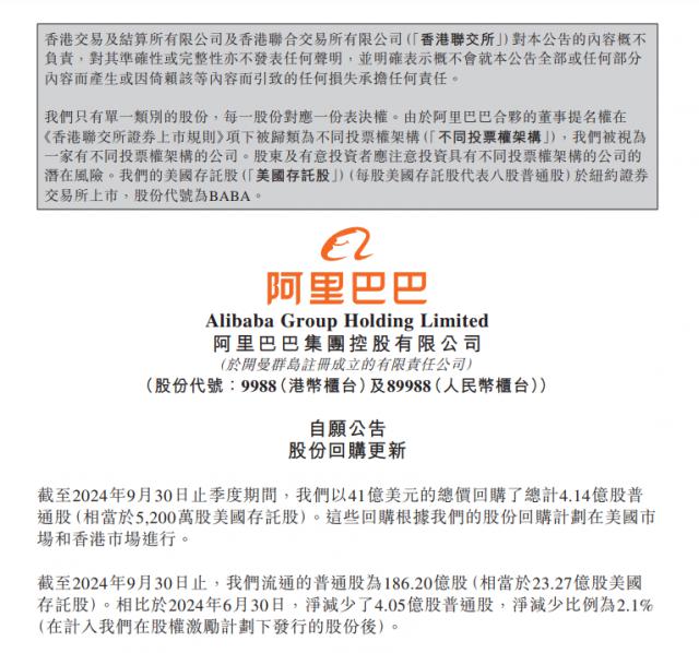 10 月 2 当天晚上,阿里巴巴在港交所宣布,截至 2024 年 9 月 30 在季度日止期间,公司以 41 总价回购了亿美元,总价 4.14 普通股亿股(相当于 5200 万股美国存托股)。根据公司的股份回购,这些回购计划在美国市场和中国香港市场进行。