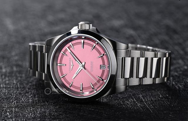 今天和大家分享的这款浪琴手表康卡斯悦动系列手表,最引人注目的是它充满活力的粉色表盘。这种粉色既不太甜也不太温柔优雅,就像春天绽放的花朵,散发出清新淡雅的气息。