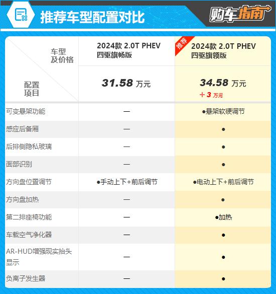 从配置对比来看,推荐车型比入门级车型增加了很多实用设备,包括方向盘加热、第二排座椅加热、感应后备箱等功能。与此同时,还具有软硬调节的可变悬架功能和 AR-HUD 提升现实抬头显示等高级设备加持,能提供更舒适的用车体验。另外,后侧隐私玻璃还可以保证后排乘客的隐私。就售价而言,只需增加即可。 3 一万元就可以换上述多种装备,无疑是物有所值。