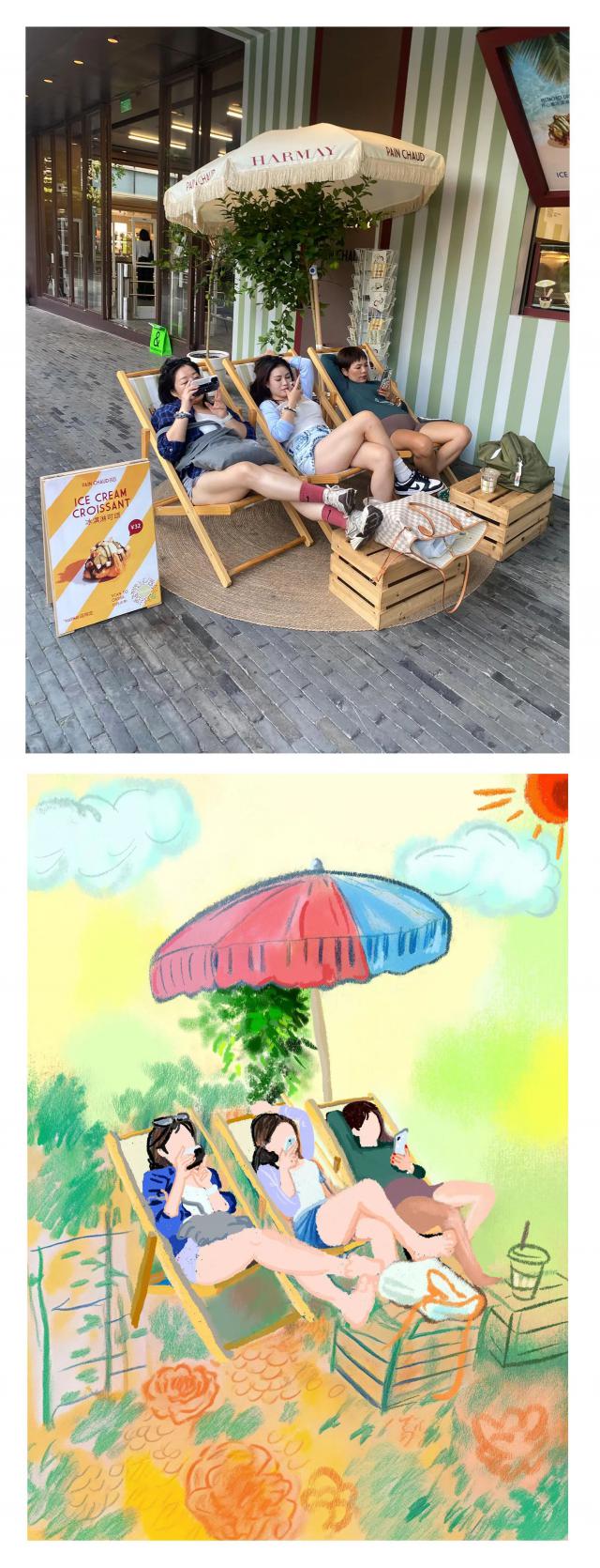 新世界附近的饮料店前,三位时髦的姐妹坐在折叠椅上,瞬间将悠闲的气氛转化为沙滩度假方式。