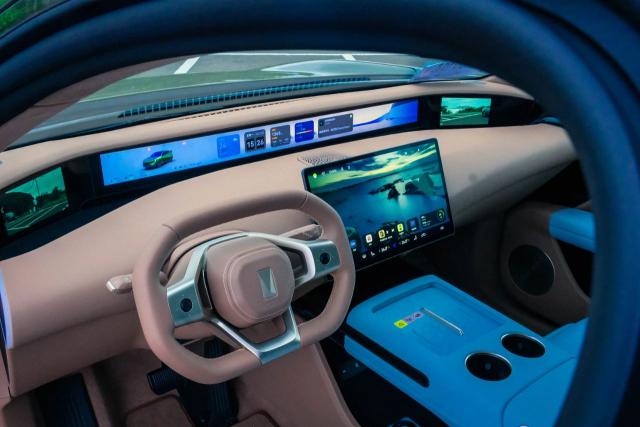 进入车内,阿维塔 07 整体驾驶舱布局与阿维塔 12 非常接近,采用了双色搭配。就材料而言,新车也采用了大量的材料。 PU 材料软包,这辆试驾车出厂仅一个星期,但是车内没有闻到新车的异味,用料方面还是相当环保健康的。