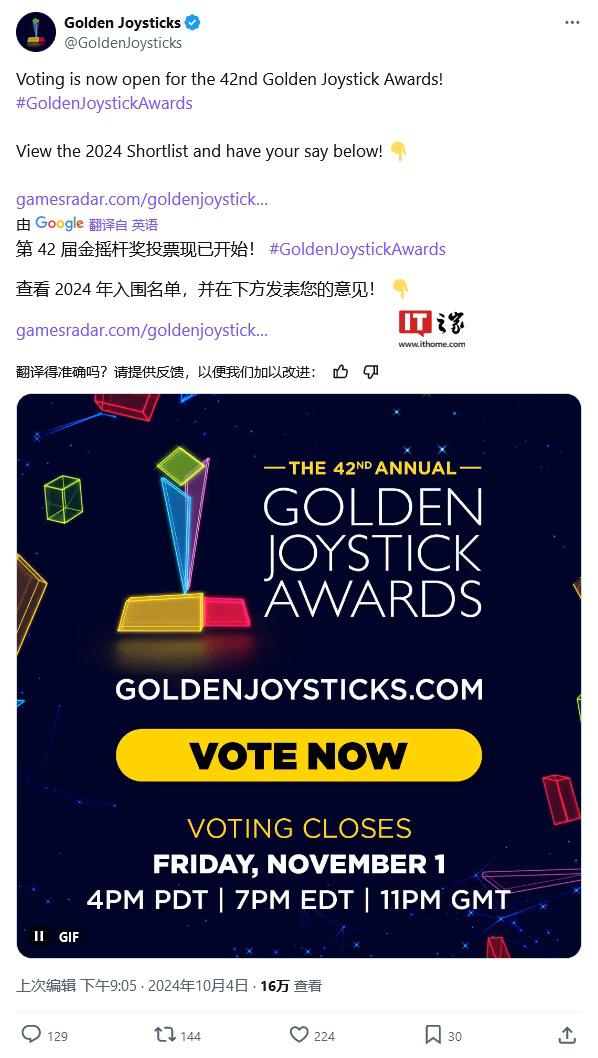 IT 世家 10 月 5 日消息,第 42 届金摇杆奖(Golden Joystick Awards)于昨日(10 月 4 日期)公布了入选游戏名单,并且打开了玩家投票通道。