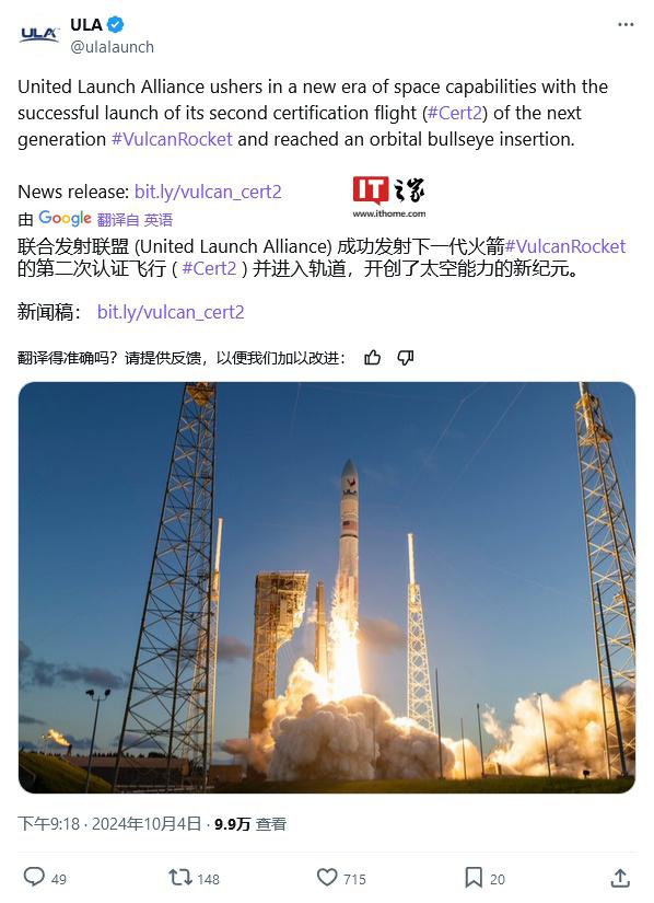 IT 世家 10 月 5 科技媒体日新闻 Space 昨日(10 月 4 日本)发布博文,报告称联合发射联盟(ULA)最新的“火神半人马座”(Vulcan Centaur)火箭队成功完成了第一名 2 次认证航行(CERT-2)。