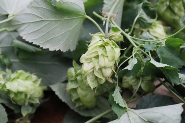 单从名字就可以知道,酒花是酿造啤酒不可缺少的材料之一。酒花是一种多年生攀援草本植物,属于桑科(也有数据称为大麻科)。它的茎、枝、叶茎上密密麻麻的绒毛和倒钩刺,叶子呈卵形或宽卵形,边缘有粗锯齿。酒花雄花排列成圆锥花序,花被片和雄蕊均为圆锥花序, 5 枚,花穗球果状,瘦果偏平。它的花期主要集中在秋季,喜欢干燥、潮湿、寒冷的气候,耐旱、耐盐碱,但对光照要求较高,适合生长在含有有机质的酸性土壤中。