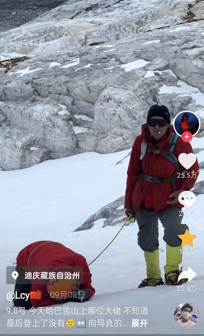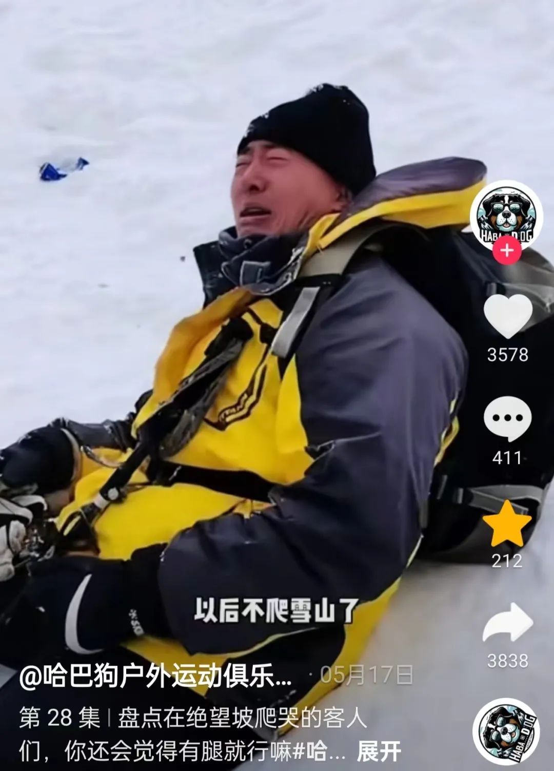 声称有腿就可以上哈巴雪山,把腿断了也不一定能登顶,指导在前面拉安全绳,人在后面累得用四肢走路。