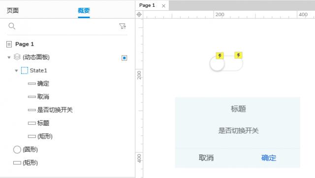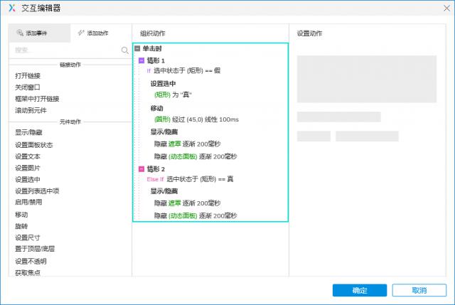 情况 1:单击添加条件,选择正确的状态,“矩形”, == ",当值为“假”时,设置选定矩形为“真”,“线性” 100 "ms通过(-45,0)坐标移动圆形元件"渐进" " 200 "ms隐藏遮盖 "逐渐" " 200 "ms隐藏了二次确认弹窗。