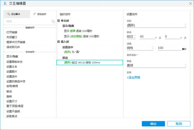 2. 单击新建交互,选择载入时选择的矩形为“真”、“线性” 100 "ms移动圆形元件通过(45,0)坐标。