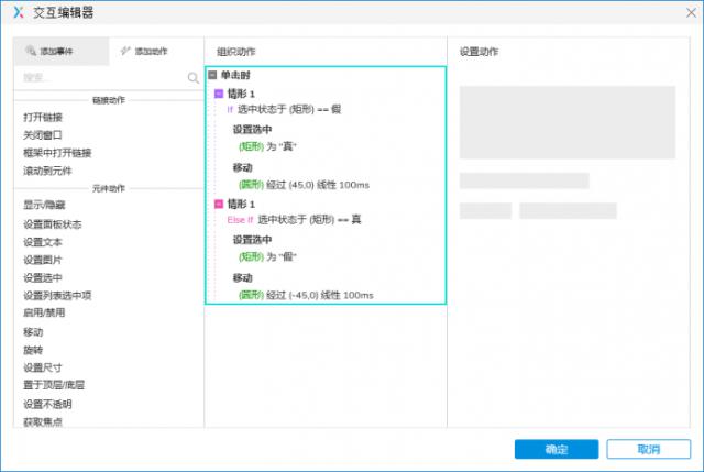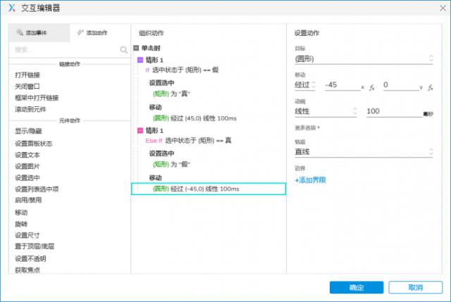 情况 2:单击添加条件,选择正确的状态,“矩形”, == ",当值为“真”时,设定选择矩形为“假”,“线性” 100 "ms移动圆形元件通过(-45,0)坐标。