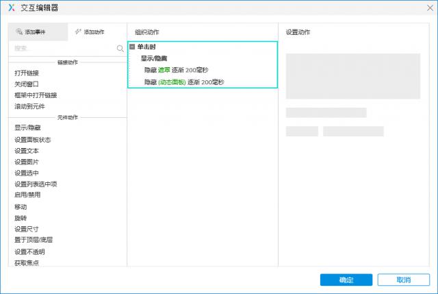 1. 选择遮盖元件,在交互窗格点击新建交互,选择点击时,“渐进” " 200 "ms隐藏遮盖 "逐渐" " 200 "ms隐藏了二次确认弹窗。
