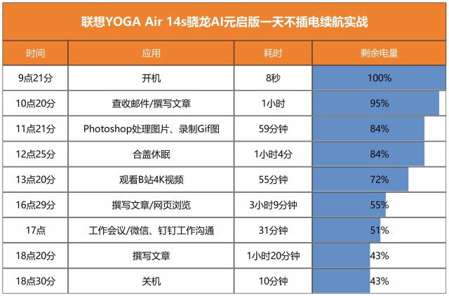 经过一天的实际应用,我们可以看到测试机满足一天不插电的办公需求是没有问题的。除了这一天,作者 1 除了一个多小时的合盖休眠,这款产品一直在用来办公,最后还有 43% 与普通电量相比,功率更高 x86 Windows 原来,续航能力显然更好。下面是一天不插电的续航记录: