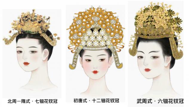 在此必须提到一个名词"花树","十二花树"真正用数量来规定等级,或者说隋唐时期开始的说法,一般用命女的身份等级来比较使用的花树数量。同样,"钿钗"也是如此。但是不同的是,花树对比的是类翟衣这样的大礼服,而“发夹”对比的是发夹的礼服。
