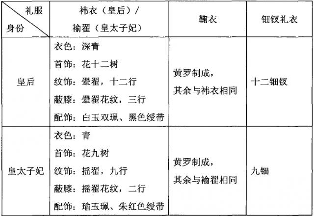 例如唐皇后:花十二树(小花如大花之数,两博鬓);皇太子妃:花九树(小花如大花之数,并两博鬓);内外命妇:一品九数,二品八数,三品七数,四品六数,五品五数(施两博鬓,宝宝饰,宝宝准花树)。