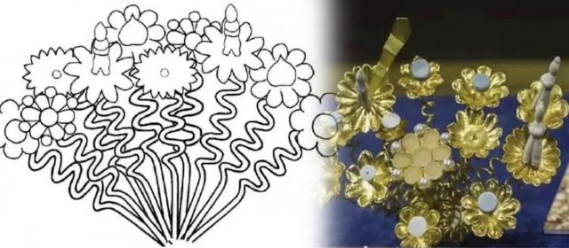 大多数花草树木都是由不同大小的金银花制成的,很容易损坏,所以现在考古发现的饰品都是残缺的花枝或者散落的花朵。这儿的花树并非我们想像的那样,而是真的有花,还有“小人”——