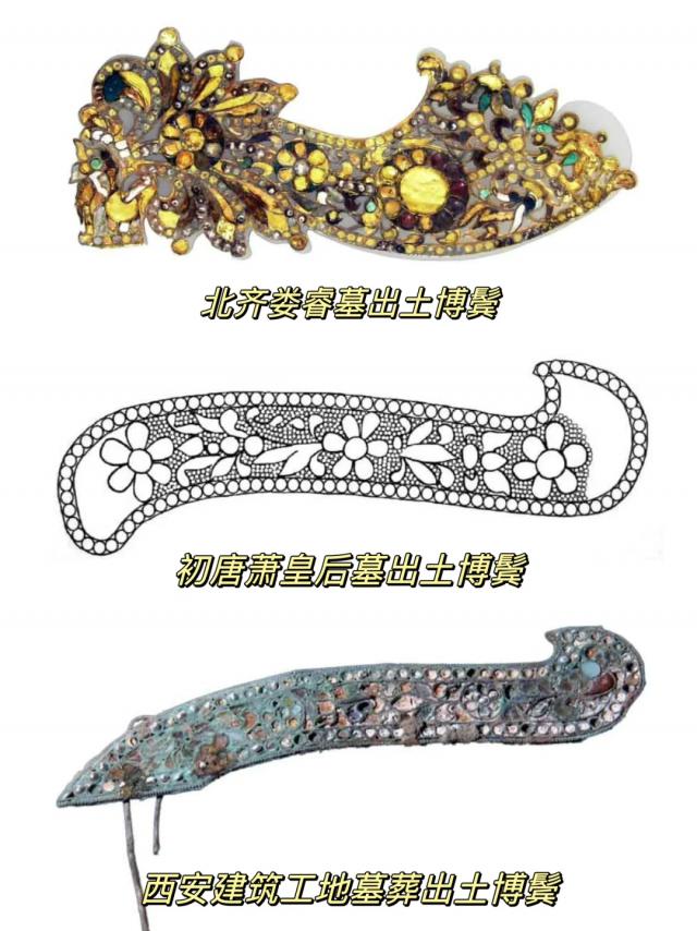 到了唐朝,博鬓的方式更加多样化,例如萧皇后在墓地里,博鬓猜测是直接固定在冠体两侧。