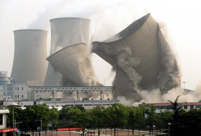 2010 年 9 月 16 日本,位于浙江省长兴县的华能国际电力有限公司长兴电厂根据政府节能减排工作安排,拆除了两个定向爆破。 90 米高的冷却塔。新华社记者 徐昱 摄