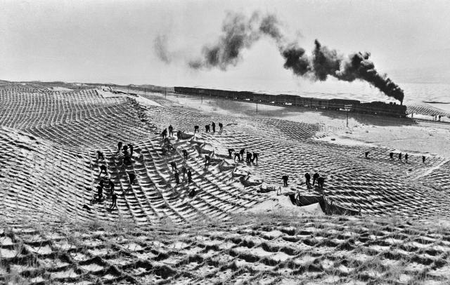 列车在包兰铁路上行驶,治沙工人在固定流沙的草方格中种植沙生植物。(1961年 年 11 月 8 日发)新华社(李福铸 摄)