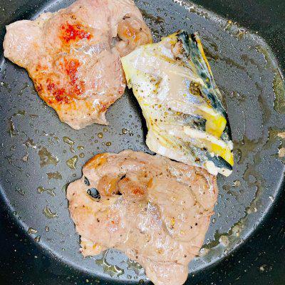 3、不要在锅里喷橄榄油,加热后加入牛排和青花鱼。