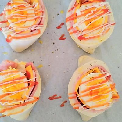 8、表面撒上黑胡椒,挤上色拉酱和番茄沙司;