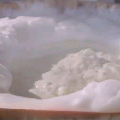 3、加入准备好的石膏水,用漂浮反复打倒地,使石膏水与豆浆更加均匀地结合,然后熄火,等待豆花的形成。