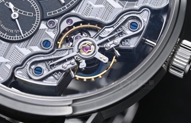 此外,必须提到的是,这是格拉苏蒂第一次在偏心机芯倒置手表上添加镀钛装饰。四分之三的夹板,双鹅颈的微调框架,蓝钢螺丝和红宝石轴承的边缘都用黑色镀钛勾住,使得整个盘面看起来非常立体和高级。