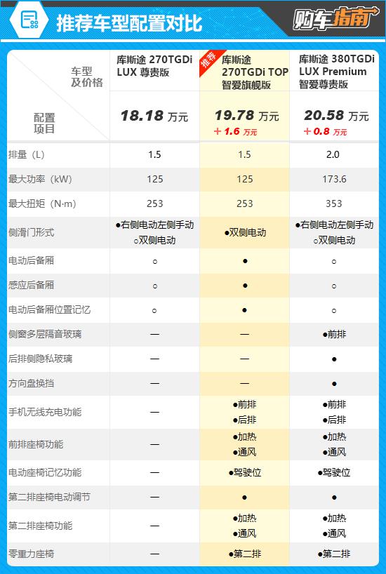 从综合配备表现来看,个人更推荐售价。 19.78 万元的 270TGDi TOP 智爱旗舰版。与低端车型相比,推荐车型升级了两侧电动侧滑门和电动后备箱的配置,同时增加了前排和第二排座椅的加热。 / 通风、第二排零重力座椅等舒适配置,而购车预算只需增加 1.6 一万元,显然是物有所值。