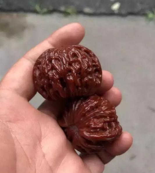 这种手掌盘玩的核桃通常颜色较重,消除了核桃皮质差的情况。同等品质的核桃汗手颜色较暗,桨层通透性差,挂瓷不明显。