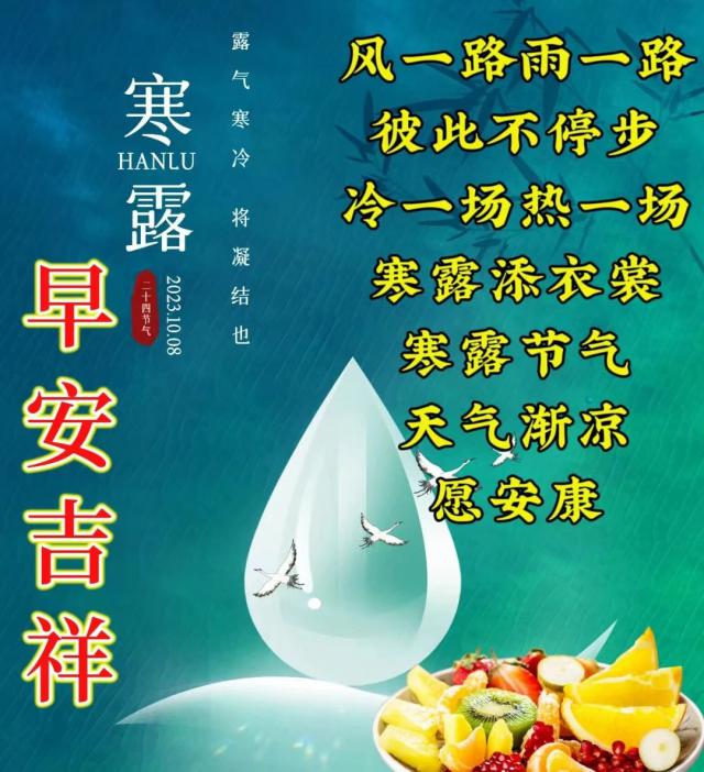 早上好,天气转凉了,远方的朋友们,请记得加衣服。虽然我们今天分开了,但你永远在我心里,永远不会忘记。今天的寒露祝福,祝你秋天健康。愿你珍惜自己的身体,每天健康。