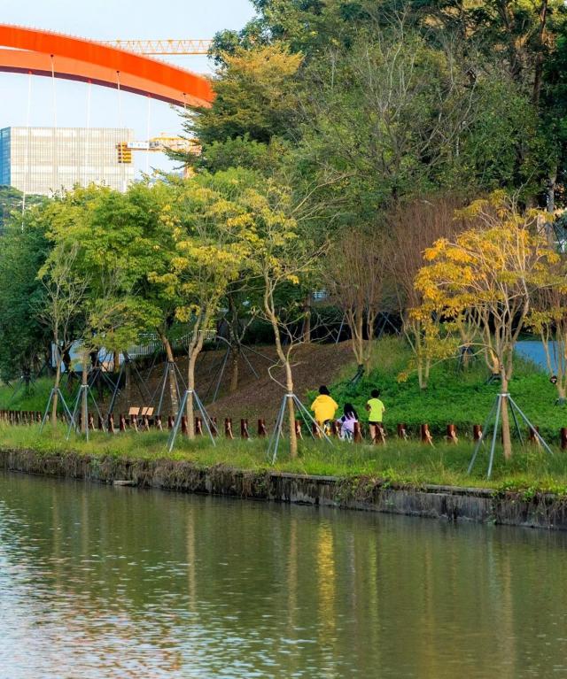 龙岗河沿河碧道徒步骑行的市民。@点评 游侠 / 摄