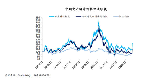 “近日,美联储超出预期,大幅降息,国内出台了一系列政策组合拳,中国资产价格从低位持续快速修复。国庆前后几天港股和a股市场都在上涨,中国资产美股中国证券交易所也表现强劲。”国泰君安国际指出。