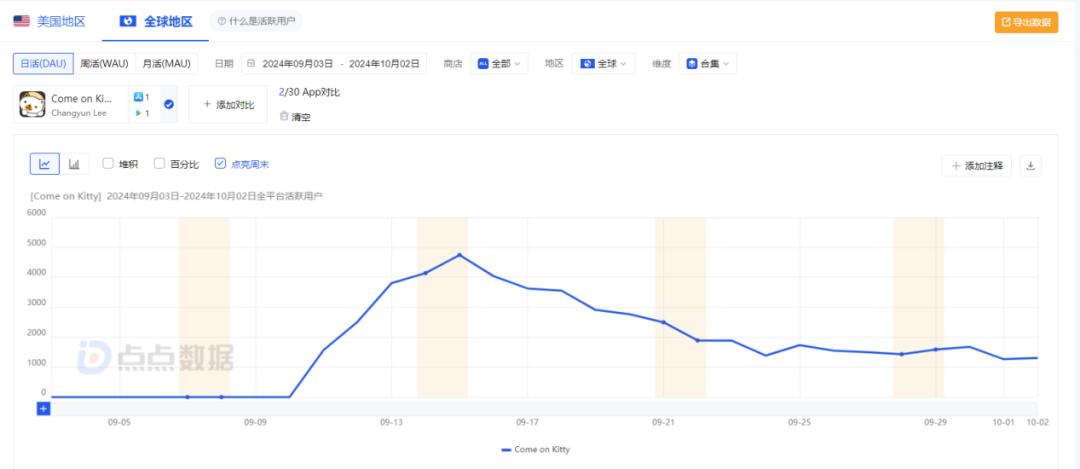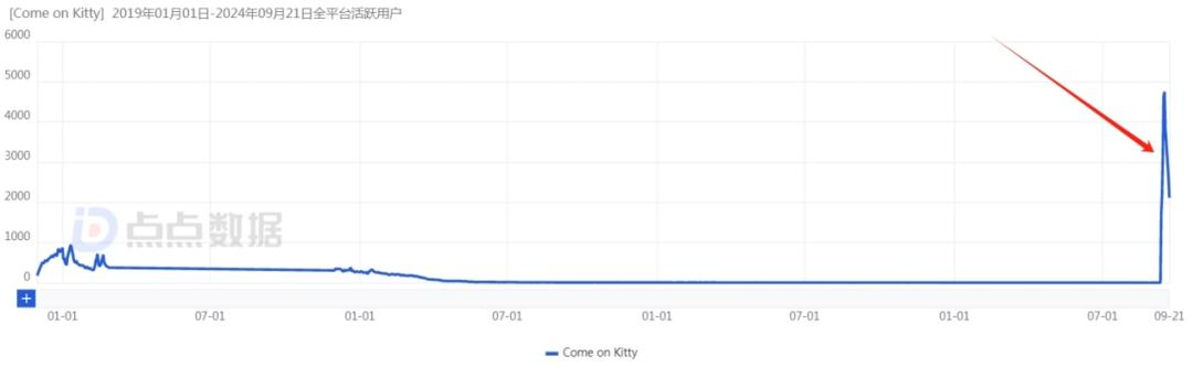 自从上线以来就超越了 5 年复一年,「Come on Kitty」的 DAU 最高峰发生在最近的攀登期间。 |信息来源:点点数据