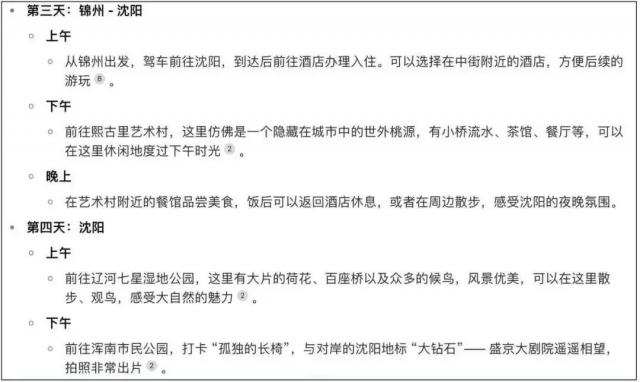 另一方面,在景点推荐中,软件推荐的景点并不具备“特色”。因为我的指令明确指出绕过网络名人中人流量大的景点,但从各种推荐来看,基本都集中在各大网络名人的打卡点,比如沈阳故宫。
