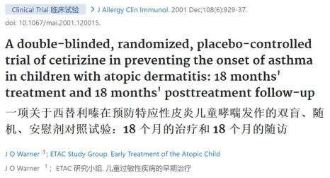 这篇ETACC于1998年发布。 (Early Treatment of the Atopic Child,儿童特应性疾病的常规治疗) 据报道,410名1-2岁儿童服用西替利嗪18个月,未发现明显不良反应,并能有效控制过敏症状。