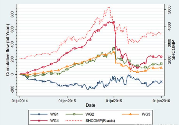 下图选自清华大学五道口金融学院。《Wealth Redistribution in the Chinese Stock Market: the Role of Bubbles and Crashes》根据证券账户的市值和现金,论文分为四个等级,图中WG1为50万以下散户,占85%,WG2和WG3是中户,WG4是市值超过1000万的大户,其户数占0.5%。
