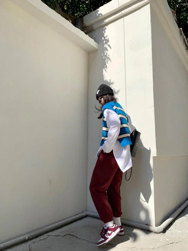 太喜欢这种配色了,酒红色的卫裤的确小而显瘦,秋冬有质感的色彩!