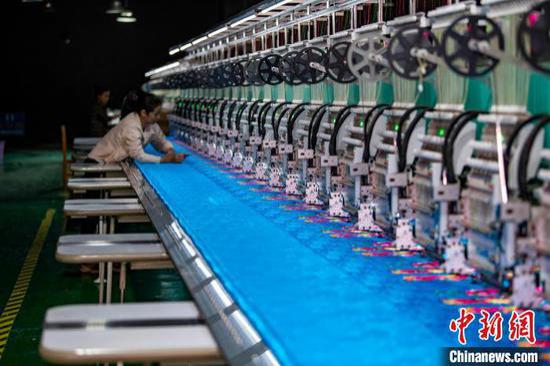 △ 10 月 8 日本,在贵州省江县某民族刺绣公司生产线上,工人们正在使用数控机床生产刺绣产品。吴德军 摄