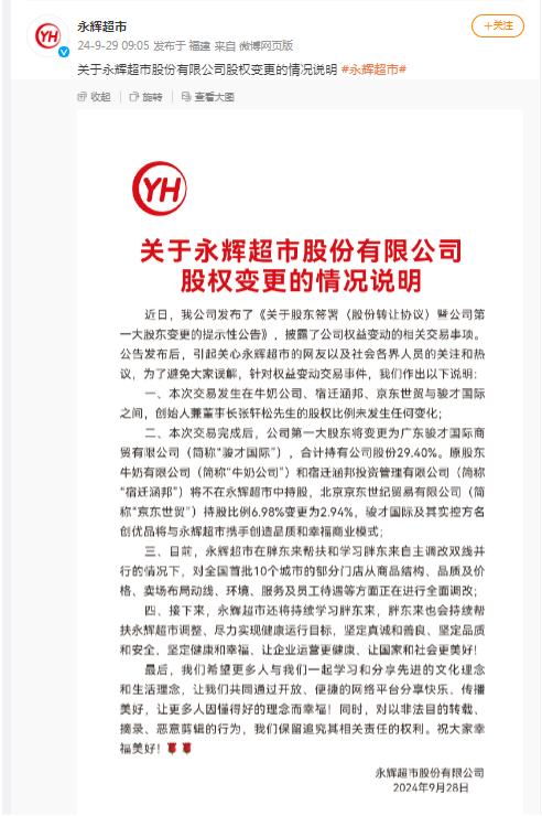 随着各种谣言的出现,永辉超市发布公告澄清,主要内容有两个。第一,只是大股东变了,张轩松先生的股权比例没有变。第二,继续与胖东来合作。