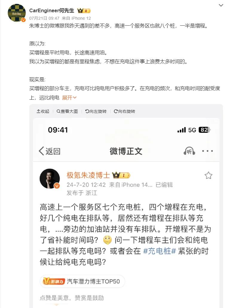 今年7月,极端氪星的朱凌博士提到了一个现象,在高速公路上,一个服务区有七个充电桩,四个增程充电。几个纯电在排队,旁边的加油站没有车排队。他指出,增程不是为了节省能源补充时间吗?增程车主会在充电桩紧张的情况下给纯电车主吗?