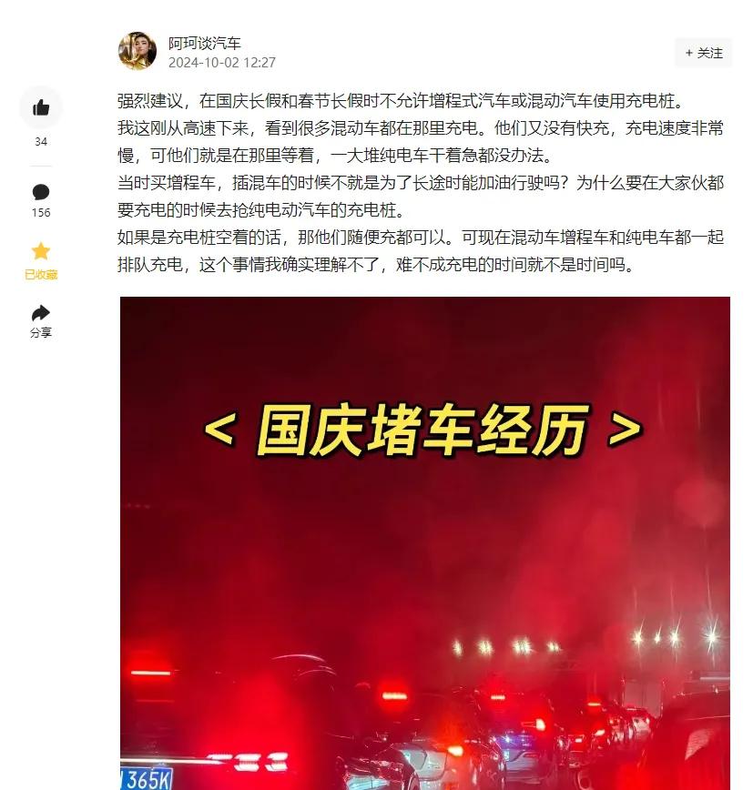 有网友从高速下来,看到很多混合动力汽车在那里充电,强烈建议国庆假期和春节假期不要使用增程式汽车或混合动力汽车的充电桩。他们的充电效率很慢,很多纯电车都没办法。当时他们买了增程,插混合动力汽车的时候,不就是为了长途开油吗?