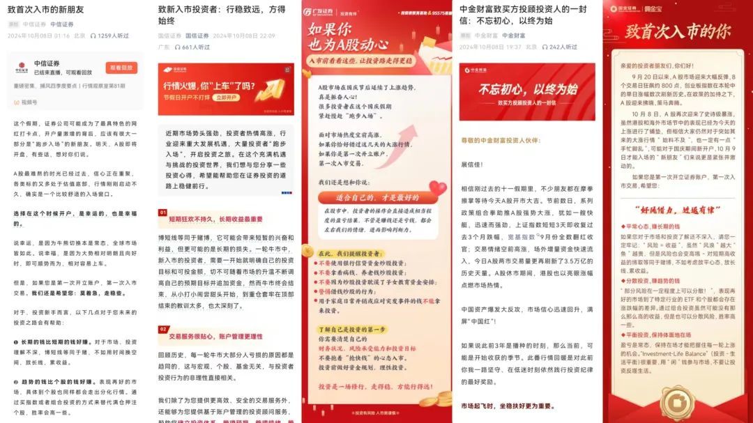 中国证券公司记者注意到,近日,中国多家证券公司对新投资者进行了投资者教育,如上述多家证券公司向首次进入市场的投资者讲解了进入市场的投资知识,如如何进行银行证券转账和股票交易;委托和交易的区别;交割规则;交易时间;涨跌限制;ETF优势等。东吴证券还提供“新手投资指南”,讲解基本交易方式,如何使用交易软件等。