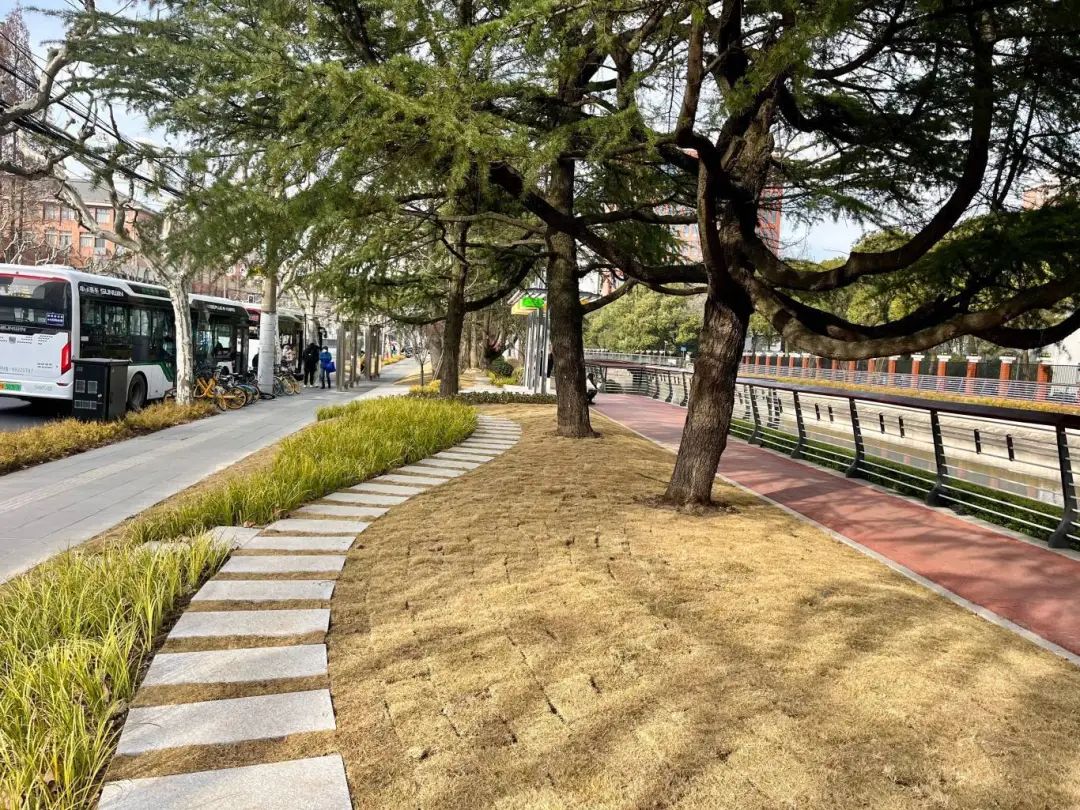 黄石路,天钥桥南路-龙耀路)项目完成后,徐汇滨江龙南地区慢行网络断点开通,让附近居民无需绕道。1700米滨水步道贯穿东上澳塘岸线,绿道、滨水路、道路慢行系统有机融合,让骑手和步行者在绿色环境中流畅流畅。