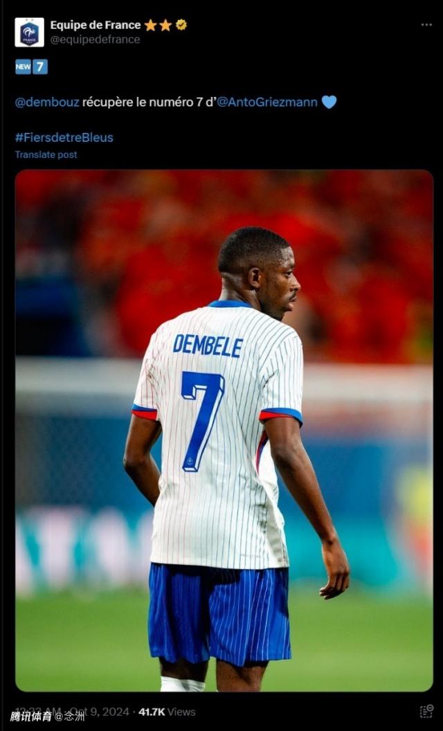 法国国家队正式宣布,登贝莱将接管格列兹曼。 7 号球衣。格列兹曼宣布退出国家队。登贝莱以前穿着法国服装 11 号战衣。