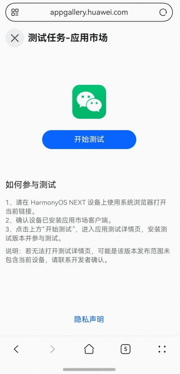 如前所述,少数受邀用户会收到测试链接的短信。点击链接参加测试并完成确认后,您将直接跳转到测试。 App Gallary ,也就是说,应用商城的建设。