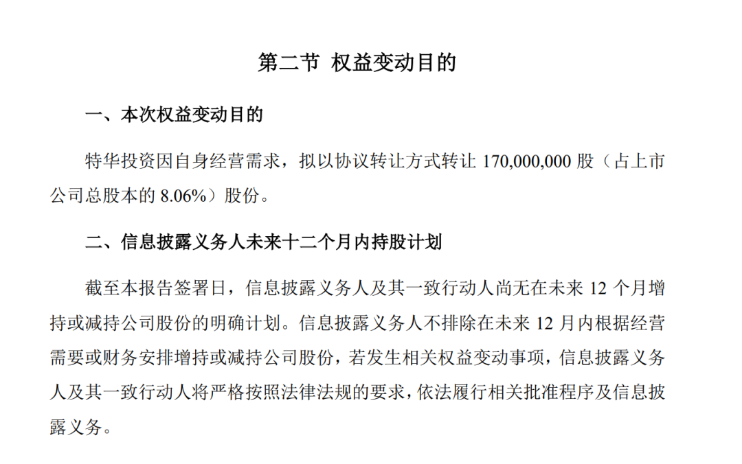 在这次权益变动之后,特华投资了8025.8383万股,占公司总股本的3.81%。