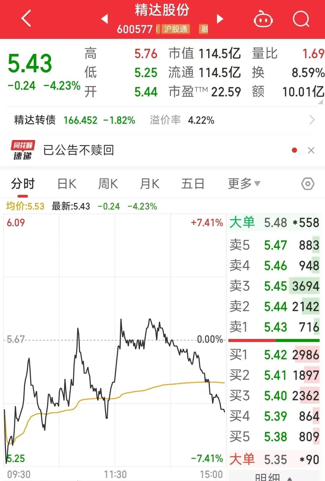 据公开资料显示,精达股份于1990年2月建厂,是中国大型特种电磁线生产企业,丝包线销量位居世界前列。目前有17家直接或间接控股公司,拥有国家级企业技术中心、国家级有色金属加工技术国家地方联合工程研究中心、省级企业技术中心、省级特殊电磁线工程技术研究中心四大中心)、12个R&D平台,如1个国家级技能大师工作室。2002年9月11日,该公司在上海证券交易所上市。市场方面,精达股份9日下跌4.23%,收于5.43元,市值达到114.5亿。九月二十四日至今的七个交易日,精达股份累计涨幅高达31.8%,市场价格上涨了28亿元。